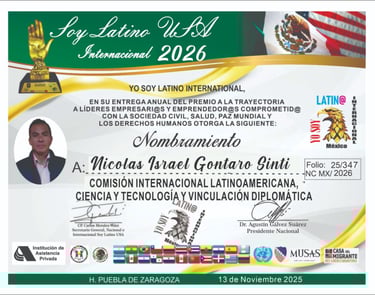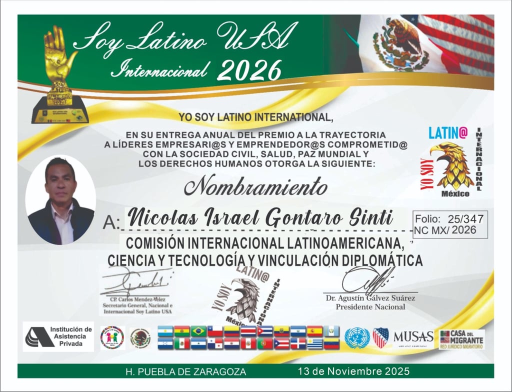 Me honra anunciar que he recibido el Nombramiento Internacional por parte de Yo Soy Latino Internacional / Soy Latino USA, integrándome a la Comisión Latinoamericana de Ciencia, Tecnología y Vinculación Diplomática para el periodo 2026. Asumo este reconocimiento con compromiso y responsabilidad para seguir impulsando la innovación tecnológica, el emprendimiento latino y el apoyo a la comunidad migrante. Seguimos construyendo puentes y oportunidades para México, Estados Unidos y Latinoamérica.